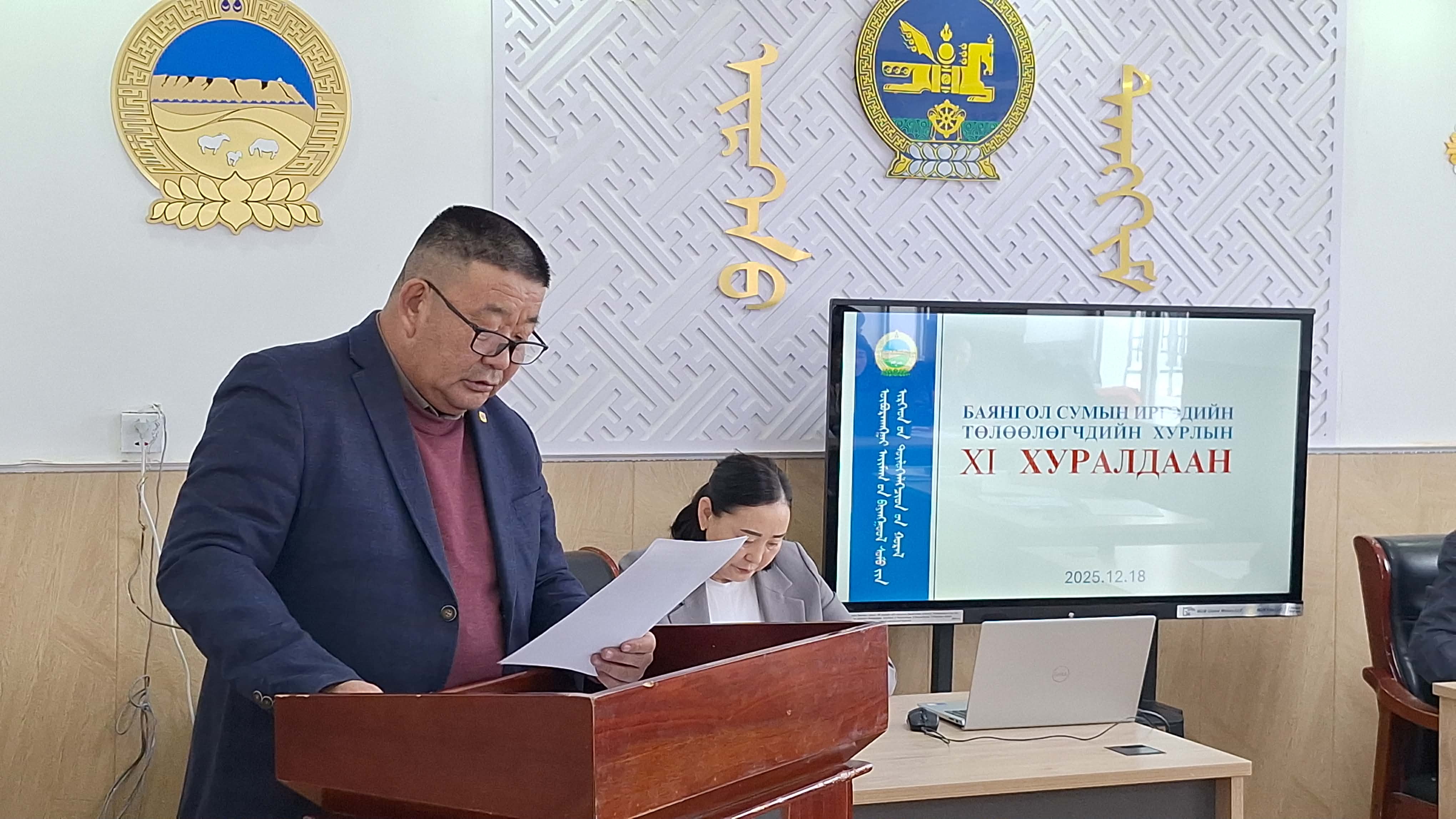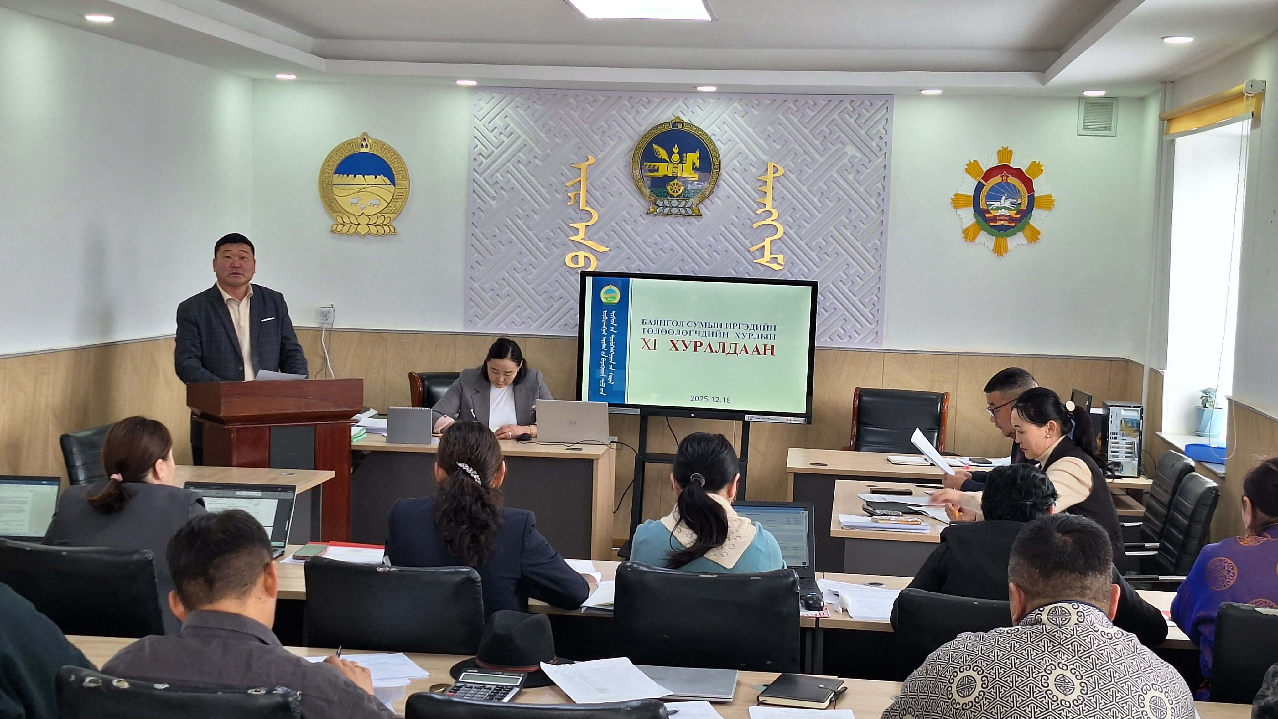 Сумын иргэдийн Төлөөлөгчдийн Хурлын ээлжит 11 дүгээр хуралдаан 2025 оны 12 дугаар сарын 18-ны өдрийн 10 цаг 35 минутанд сумын ЗДТГ-ын иргэний танхимд эхлэв. Хуралд 21 төлөөлөгчөөс 16 төлөөлөгч оролцов. Ирц 76. хувьтай байлаа. Хуралдааныг сумын иргэдийн Төлөөлөгчдийн Хурал(цаашид ИТХ гэх)-ын дарга Э.Чулуунбаатар даргалав. Хуралдаанаар: